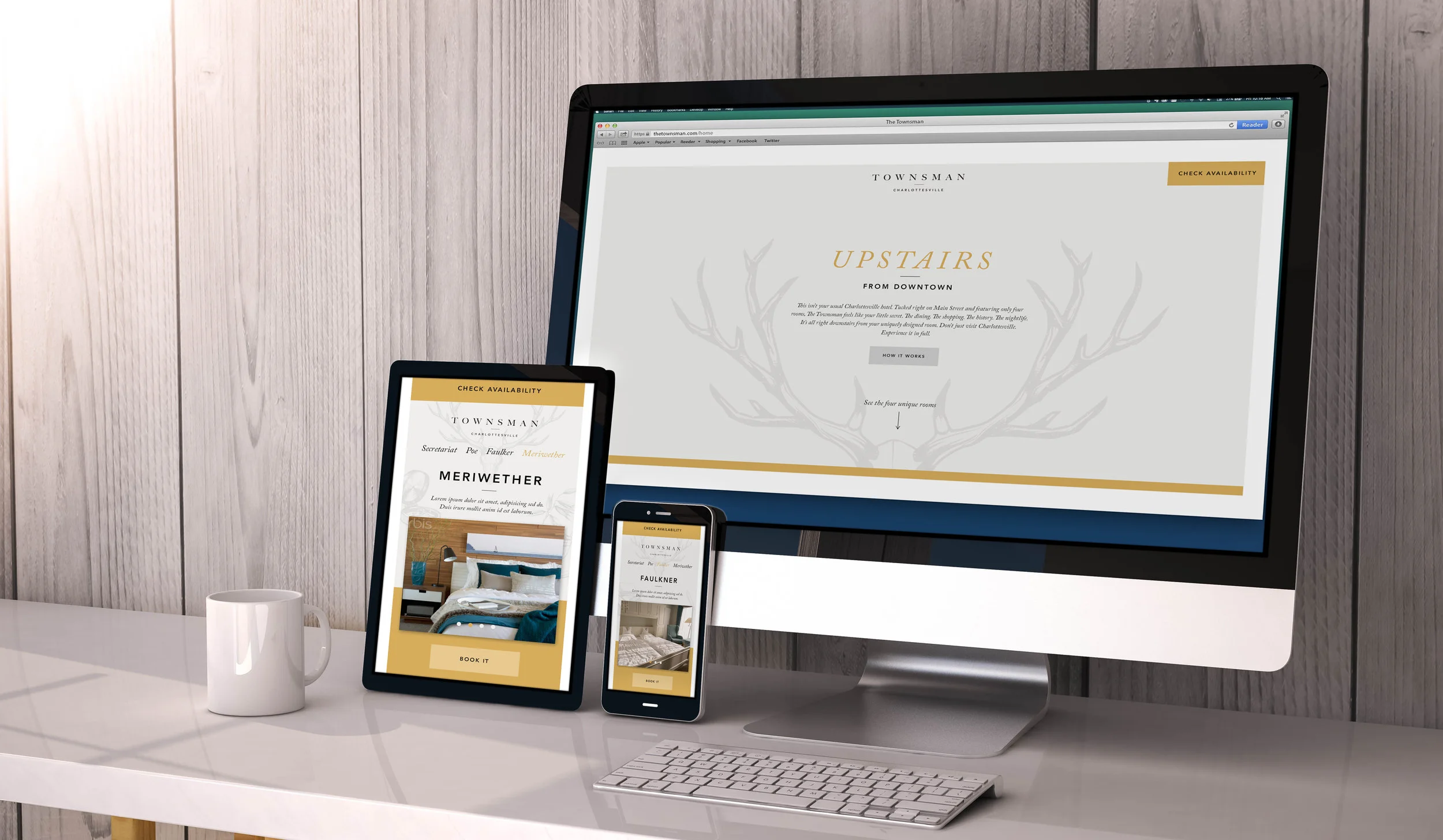 A brand that harkens back to the idea of “a man about town” wandering among people and places on Main Street, Wherever. It captures the romantic vibe of travel and the excitement of experiencing something new. We developed themes for each of the four rooms based upon famous Virginian icons and then created hand-drawn graphics to represent The Townsman and each room as well.